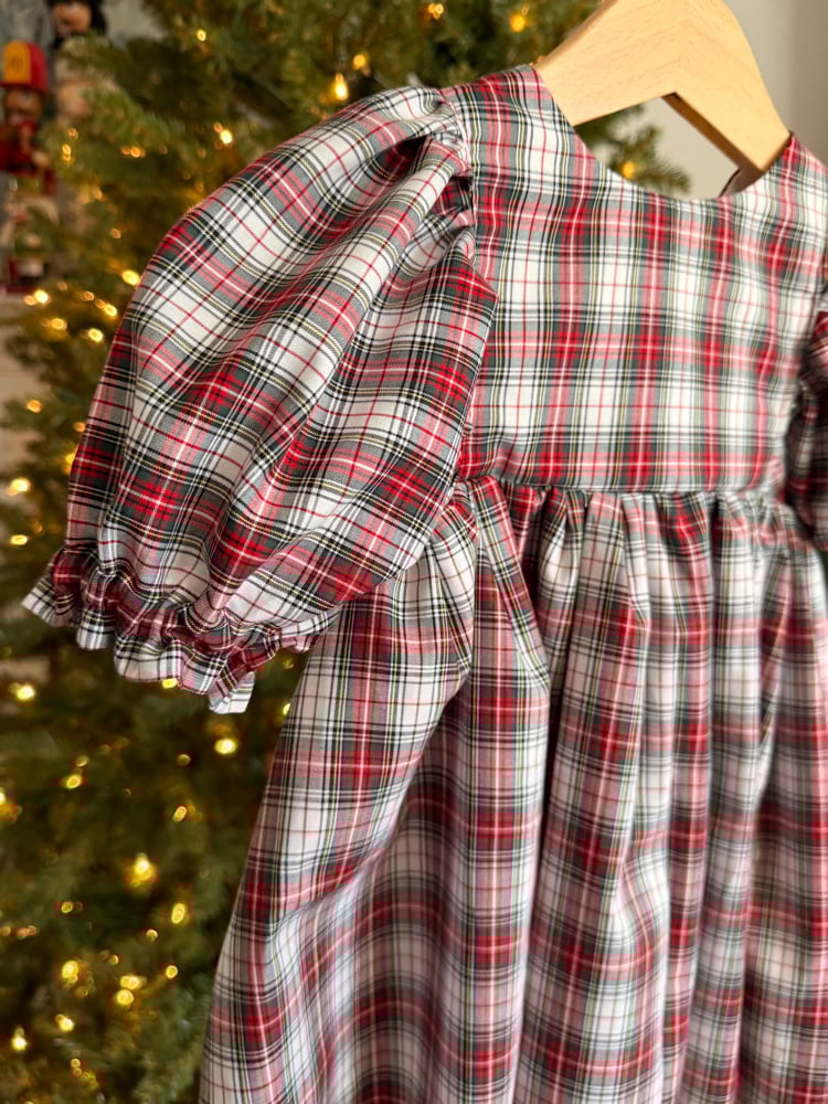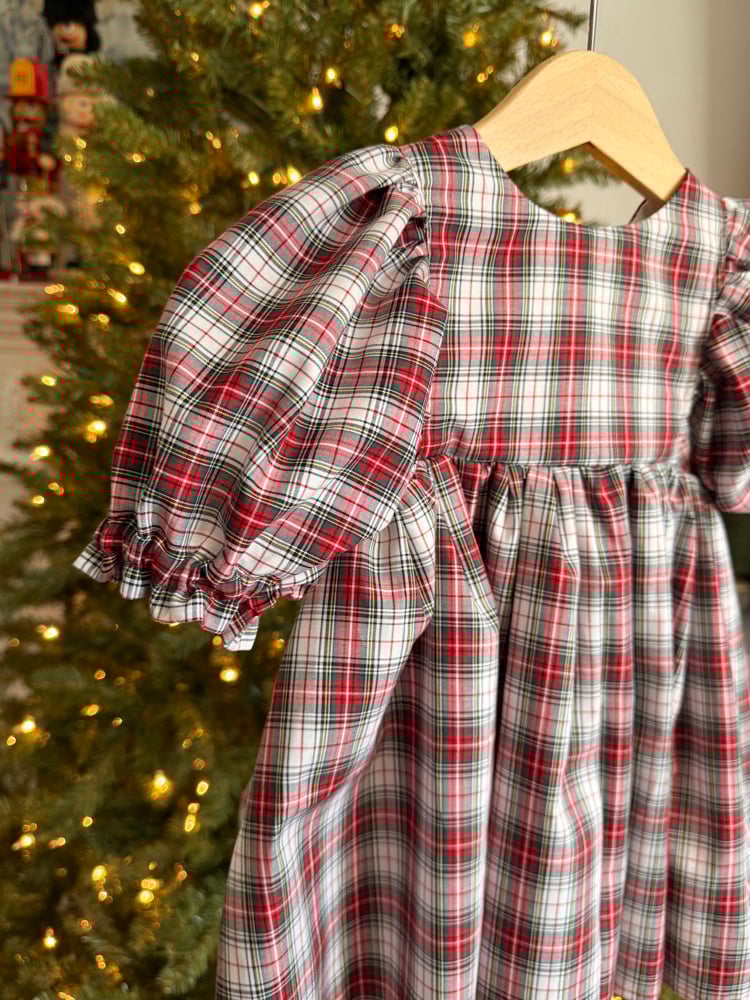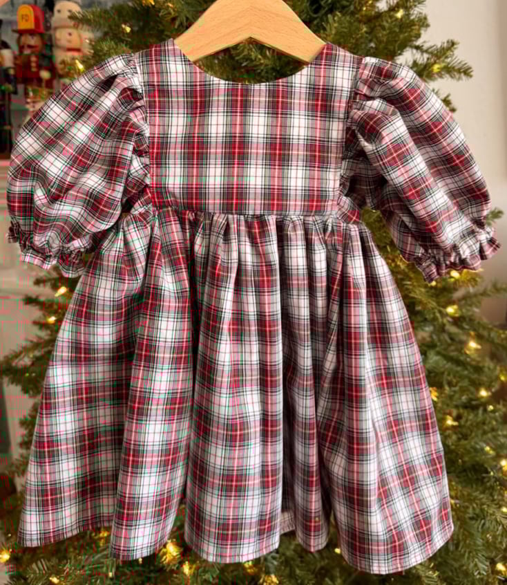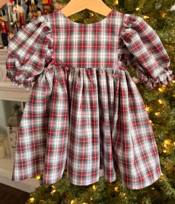 Sweet little Classic holiday dress with puff sleeves, lace trim and holiday button back closures.